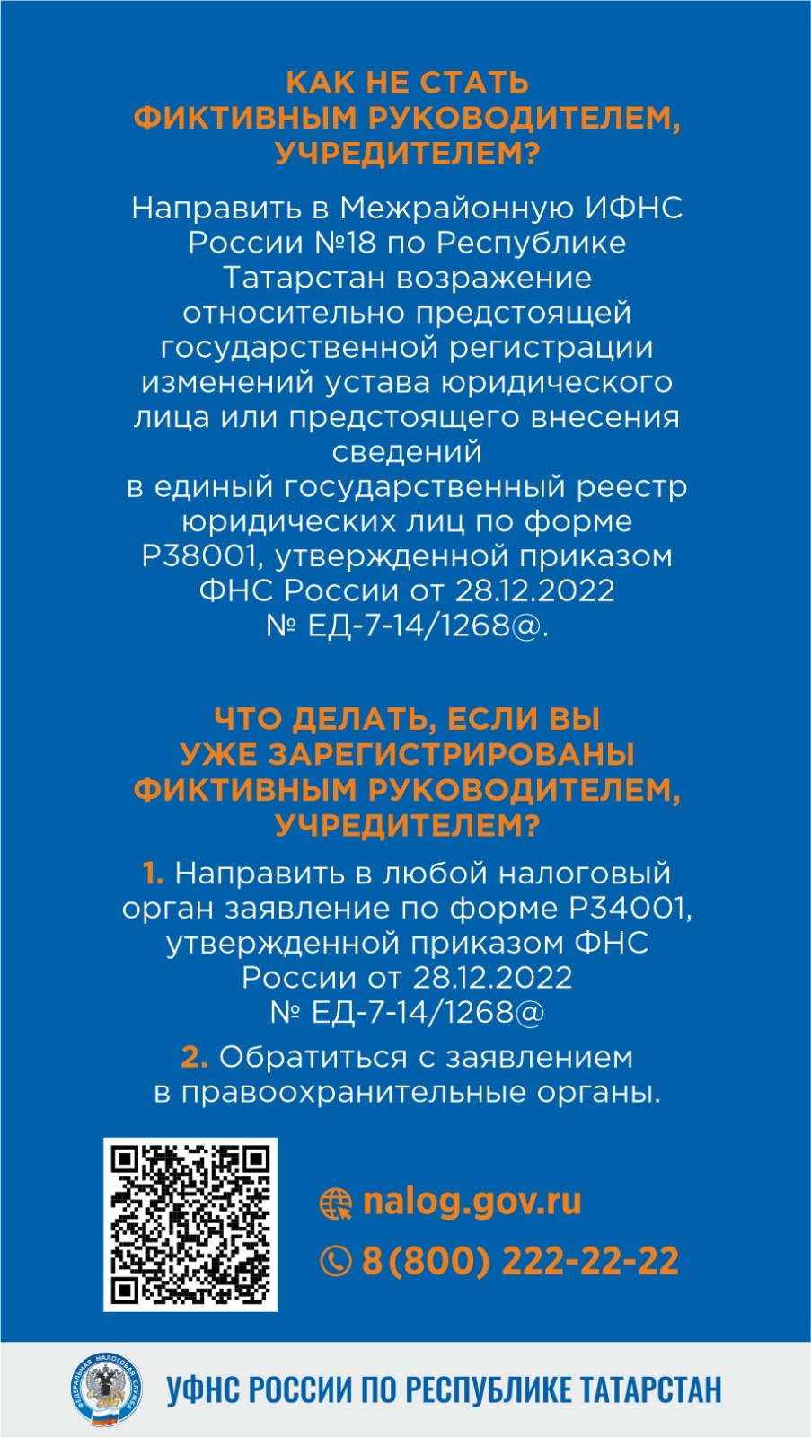 Чтобы не стать фиктивным руководителем, нужно направить в Межрайонную ИФНС России №18 по Республике Татарстан возражение относительно предстоящей государственной регистрации изменений устава юридического лица или предстоящего внесения сведений в единый государственный реестр юридических лиц по форме Р38001, утвержденной приказом ФНС России от 28.12.2022 № ЕД-7-14/1268@.