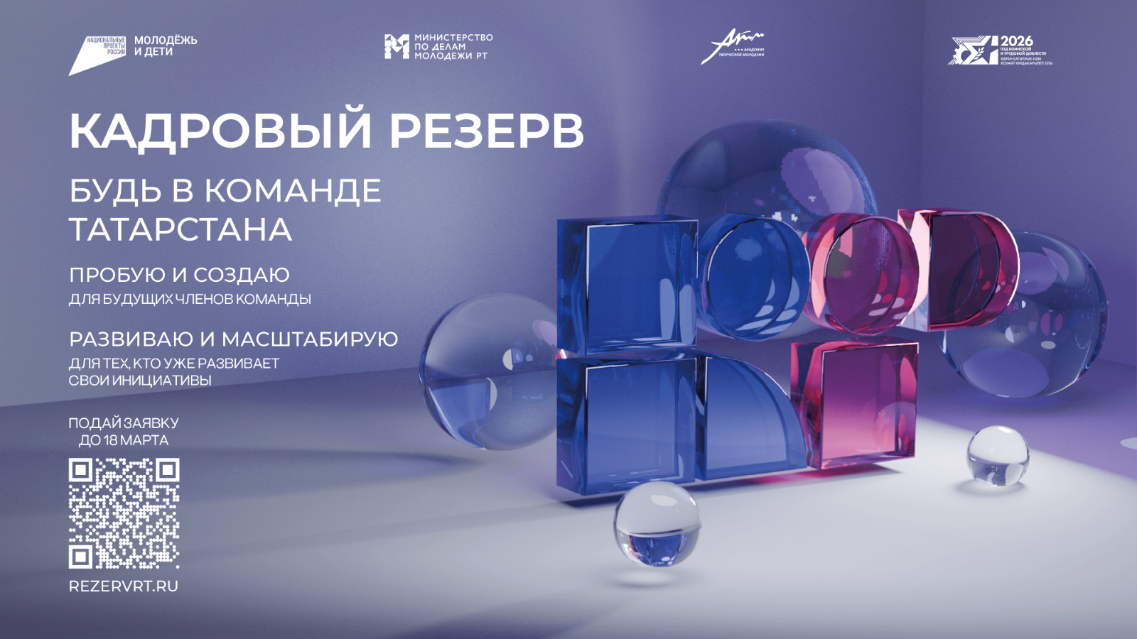 В Республике Татарстан стартовала заявочная кампания Республиканского молодёжного проекта «Кадровый резерв». Приём заявок открыт до 18 марта 2026 года на сайте www.rezervrt.ru. Проект ежегодно реализуется с 2009 года Министерством по делам молодёжи РТ совместно с Региональной общественной организацией «Академия творческой молодёжи Республики Татарстан» при поддержке Правительства РТ.