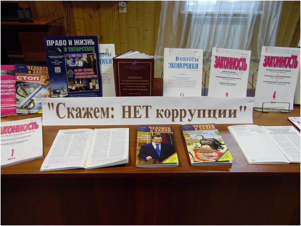 С 26 ноября в Центральной библиотеке работает тематическая книжная выставка по антикоррупционной тематике "Скажем : НЕТ коррупции ", где представлены книги и периодические издания антикоррупционной пропаганды.