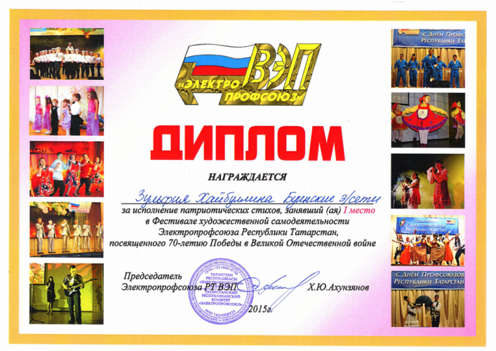 На родину с Победой вернулись работники филиала ОАО «Сетевая компания» Буинские электрические сети - участники Фестиваля художественной самодеятельности «Электропрофсоюза» РТ! В номинации «Свободный жанр» за чтение патриотических стихов Хайбуллина Зульфия – контролер Тетюшского РЭС была удостоена Диплома за 1 место, а хореографическая группа под руководством Минхановой Инны в составе Тухветова Айдара, Хайсаровой Лейсан, Камалова Рафиля, Ахметовой Люции, Ахметзяновой Диляры, Камаевой Натальи, Французова Леонида, Хамидуллиной Алсу завоевала 1 место в номинации «Танец». Название танца «Туган якка жиню белэн» оказалось пророческим!