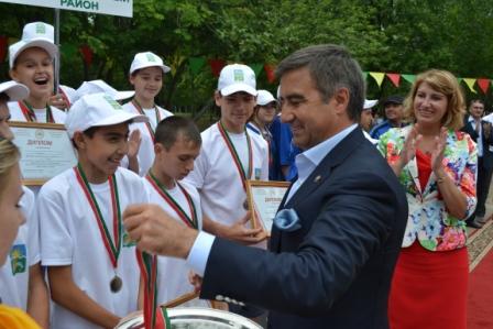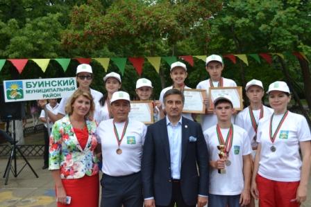 По итогам отборочного этапа "Единой декады ГТО" сборная команда обучающихся общеобразовательных организаций Буинского муниципального района приняла участие в финале регионального этапа Фестиваля ВФСК ГТО, который проводился в г. Набережные Челны РТ с 17-19 июня. В течении трех дней 13 сильнейших команд республики проходили испытания в 8 спортивных видах Фестиваля, а также в музыкальном, теоретическом, журналистском конкурсах и в конкурсе по защите проекта по продвижению комплекса ГТО среди сверстников. Нашу команду представляла делегация, состоящая из 8 учащихся школ района: Идрисов Нияз -учащийся 8 класса - Энтугановской СОШ, Македонский Александр - учащийся 9 класса СОШ им. академика Р.З. Сагдеева г.Буинска, Дворцов Алексей - учащийся 7 класса Рунгинской СОШ, Ишимов Максим - учащийся 7 класса СОШ №5 г.Буинска, Ахметова Лилия - учащаяся 9 класса Черки-Кильдуразовской СОШ, Камаретдинова Айгуль - учащаяся 9 класса Лицея-интерната (школа для одаренных детей) г.Буинска, Ратникова Эмилия - учащаяся 7 класса СОШ №1 г.Буинска, Иванова Юля - учащаяся 6 класса Киятской СОШ, а также руководители делегации: Македонская Н.А. - заместитель начальника Управления образования по воспитательной работе и преподаватель физической культуры Лицея №2 г.Буинска Сайфутдинов Р.С.