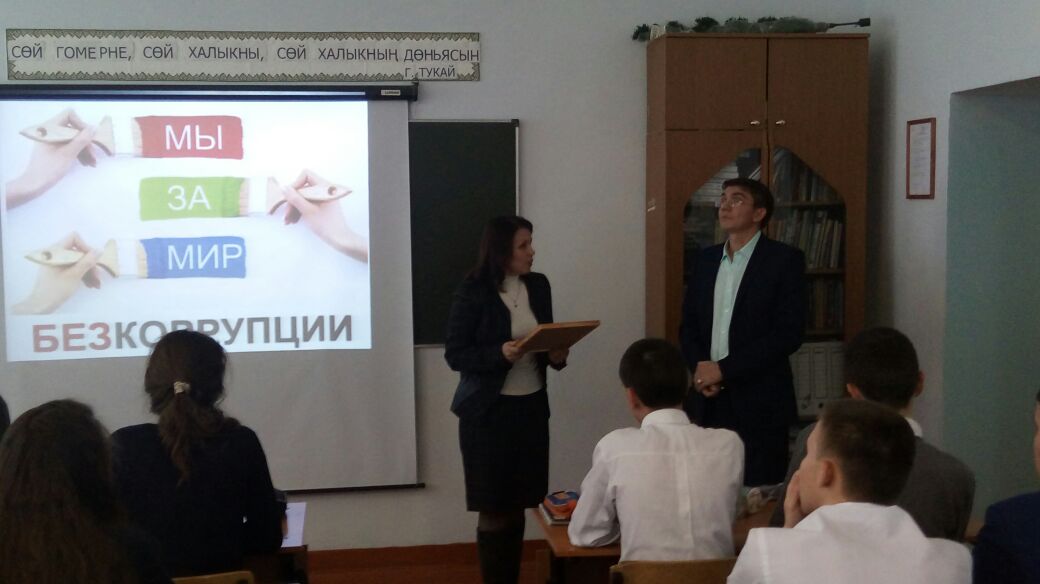 9 декабря в МБОУ «Лицей-интернат (школа для одаренных детей) города Буинска РТ» прошел районный открытый урок для учащихся 10 классов приуроченный к Международному дню борьбы с коррупцией. Урок провел учитель истории Ленар Абзалов. На мероприятии присутствовали помощник главы Буинского муниципального района по вопросам противодействия коррупции Зульфия Шайхаттарова, помощник Буинского городского прокурора Ришат Гиззатуллин и заместитель начальника управления образования по воспитательной работе Наталья Македонская.