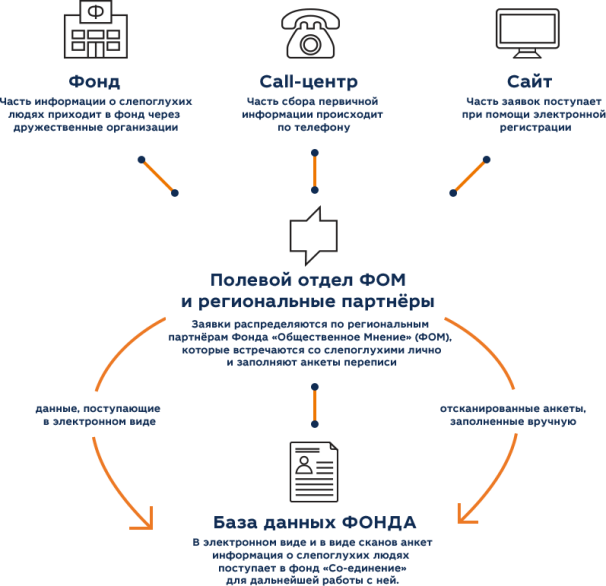 На сегодняшний день в стране отсутствуют точные данные о количестве слепоглухих людей, а значит не ведется и полноценный учет их потребностей. Фонд поддержки слепоглухих «Со-единение», созданный в апреле 2014 года, призван разработать и объединить успешные решения и практики, дающие слепоглухим людям возможность самореализации, развития и интеграции в общество. Проведение первой всероссийской переписи слепоглухих является первостепенной задачей Фонда, инициатором которой он является.