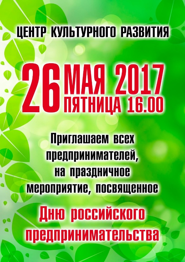По этому случаю приглашаем всех предпринимателей, а также членов их семей на праздничное мероприятие, посвященное празднованию Дня предпринимателя которое состоится 26 мая 2017 года в 16.00 в Центре культурного развития.
