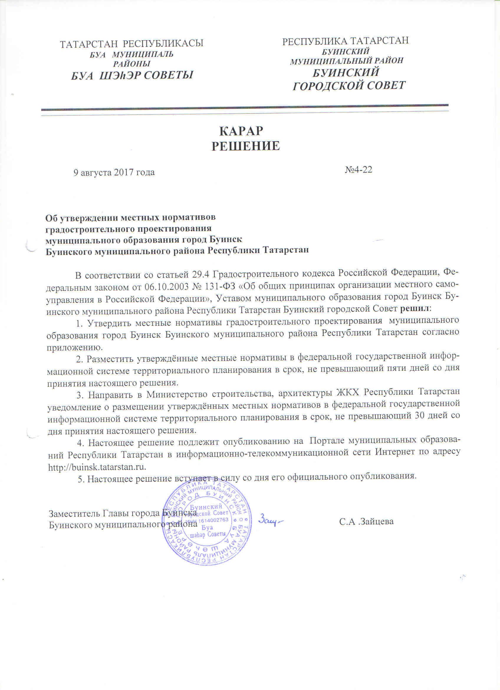 Решение №4-22 от 09.08.2017 "Об утверждении местных нормативов градостроительного проектирования муниципального образования город Буинск Буинского муниципального района Республики Татарстан"