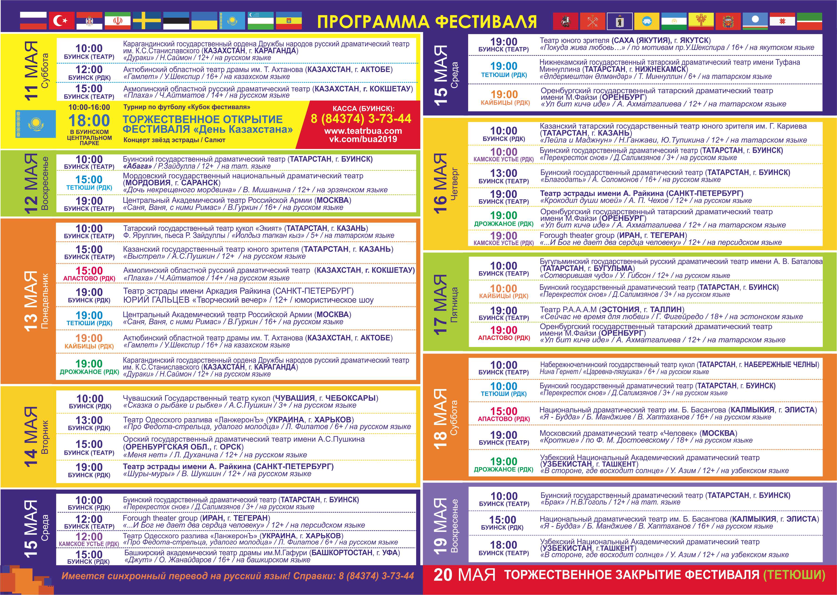Барыгызны да сәнгать һәм иҗат дөньясына чумарга чакырабыз. Фестивальдә катнашучылар һәм афишада катнашучылар белән Буа драма театры сайтында җентекләбрәк танышырга мөмкин. Билетларга заказ (84374)3-73-44 телефоны буенча.