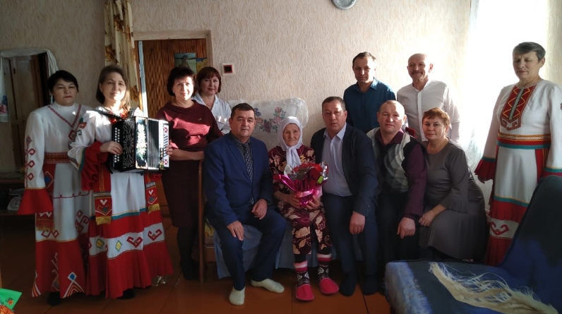 Юбиляр Ксения Данилованы авылдашлары да хөрмәтләде, алар аны җыр-моң белән котладылар.