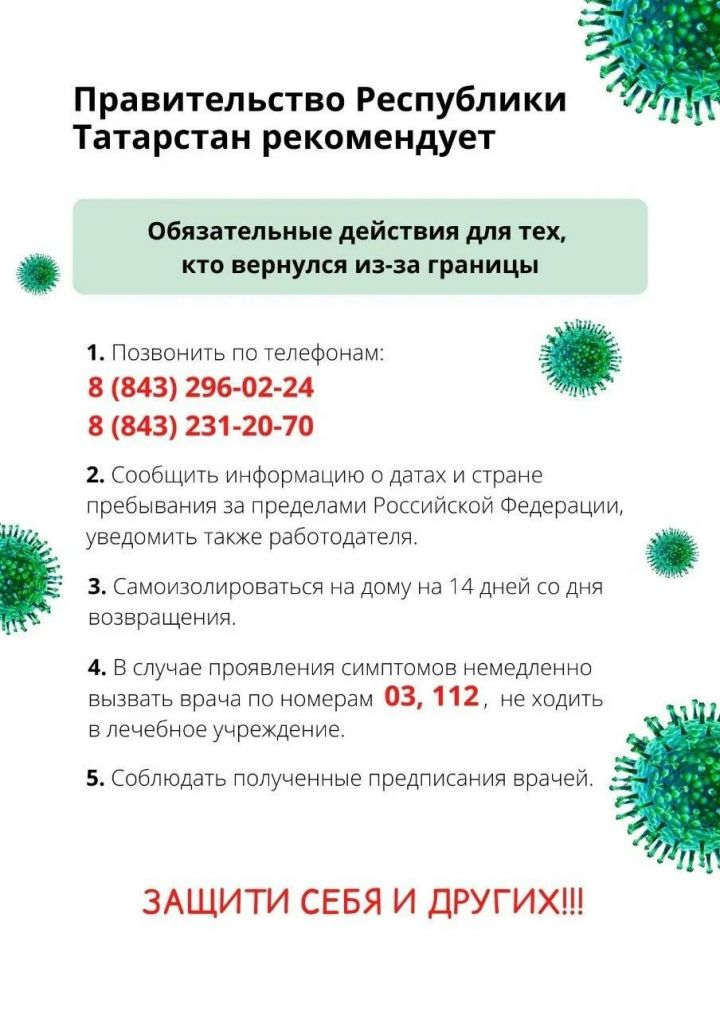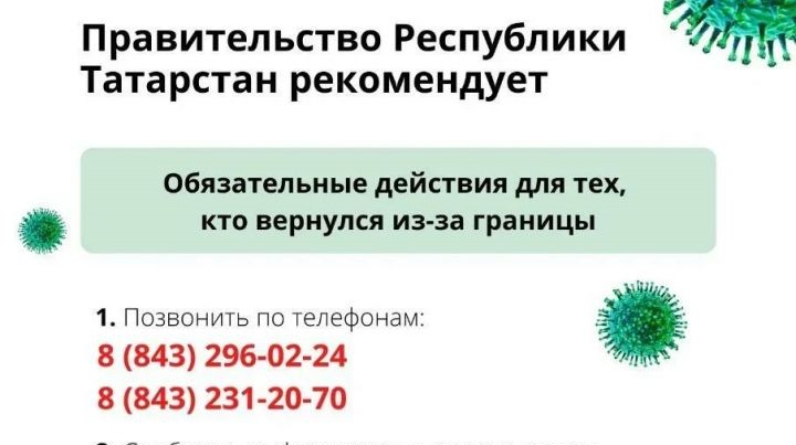 Чит ил сәфәрләреннән кайткан республиканың барлык халкын 8 (843) 296-02-24 кайнар линия телефонына кайту турында хәбәр итүне һәм ике атналык карантин үтүне сорыйлар.