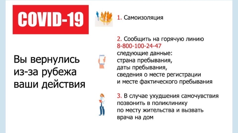 "COVID-19 булдырмау максатларында изоляция режимын тәэмин итү турында" Россия Федерациясе Баш дәүләт табибы карары нигезендә, чит илләрдән кайткан халыкны йорт шартларында 14 көн эчендә үз-үзен изоляцияләү таләпләрен тайпылышсыз үтәргә чакырабыз.