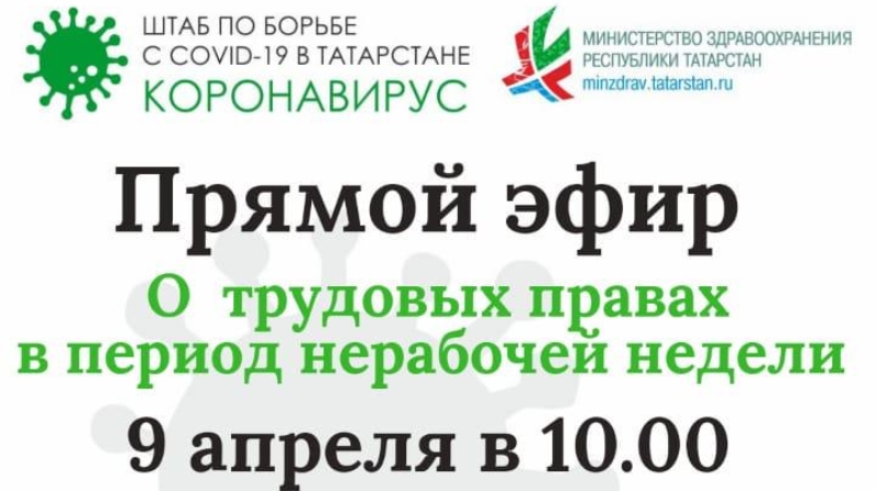 Иртәгә, 9 апрельдә, хезмәткәрләр эш бирүченең хезмәт хокукларын үтәмәве турында хәбәр итә ала, шулай ук хезмәткәрләр һәм эш бирүчеләр хезмәт законнарын куллану тәртибе турында онлайн-консультация ала алалар, шул исәптән дистанцион режимга күчкәндә һәм өйдә эшкә күчкәндә, гади яллар керткәндә һ.б. лар. Туры эфир Татарстанда COVID-19га каршы көрәш штабының рәсми сайтында stopcovid19.tatarstan. узачак. Башлана 10.00 сәгатьтә. Сорауларны stopcovid19.tatarstan. директона юлларга мөмкин.