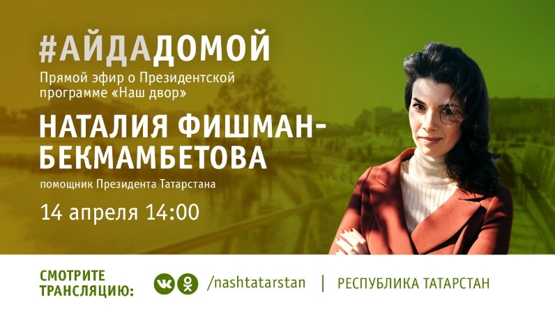 Татарстан Президенты ярдәмчесе Наталия Фишман-Бекмамбетова «Безнең ишегалды» программасы буенча республика халкының сорауларына туры эфирда җавап бирәчәк. Трансляцияне иртәгә, 14 апрельдә, «ВКонтакте» һәм «Одноклассники» социаль челтәрләрендә карарга мөмкин булачак. Башлана 14 сәгатьтә.