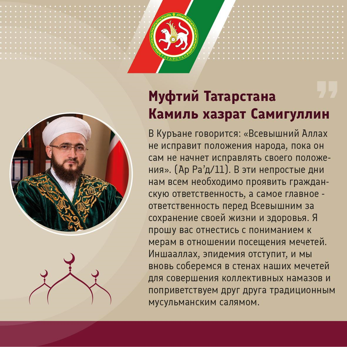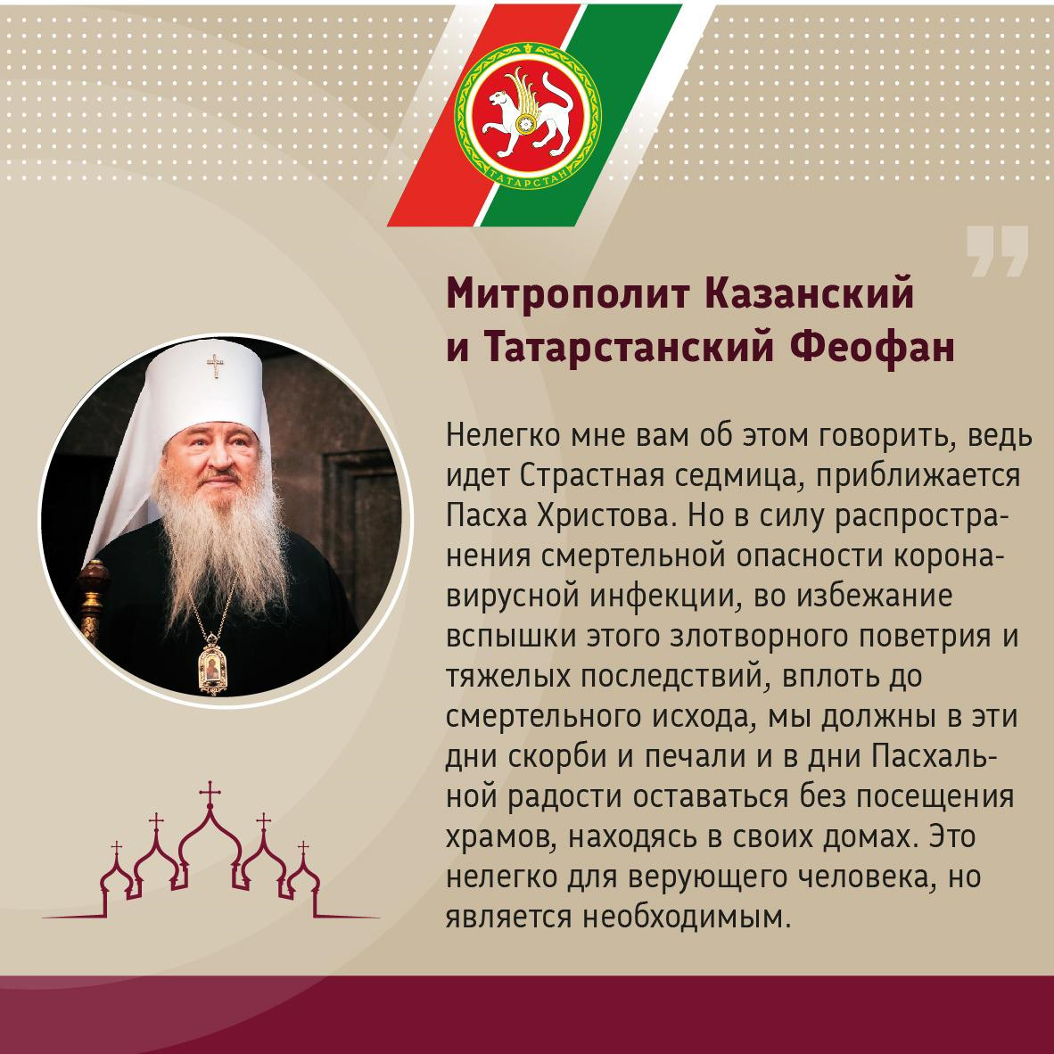 Татарстан мөфтие Камил хәзрәт Сәмигуллин һәм Казан һәм Татарстан митрополиты Феофан дин тотучыларны күрелә торган чараларга аңлап карарга һәм үз-үзеңне изоляцияләү режимын үтәп, гражданлык җаваплылыгын күрсәтергә чакырдылар