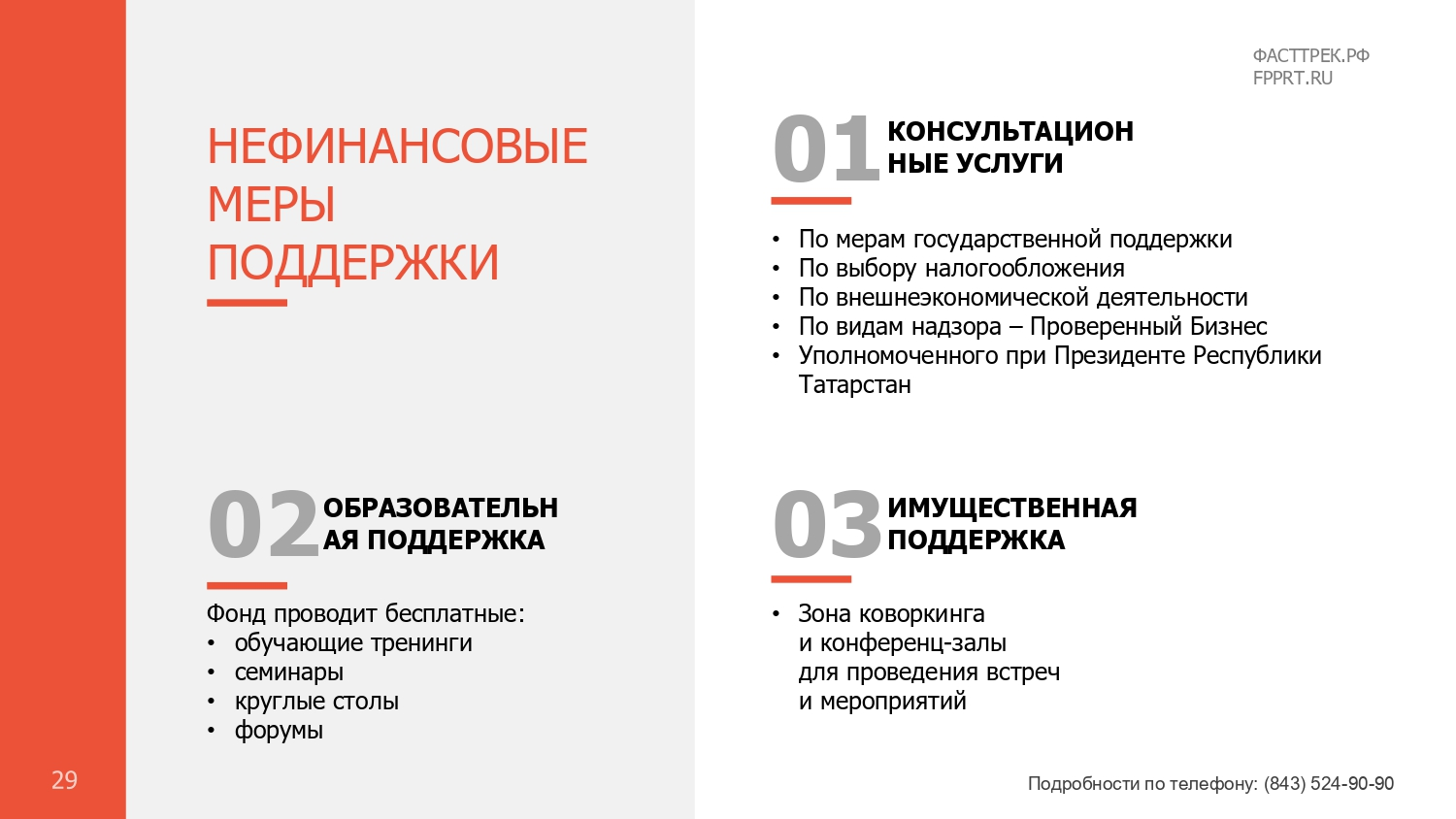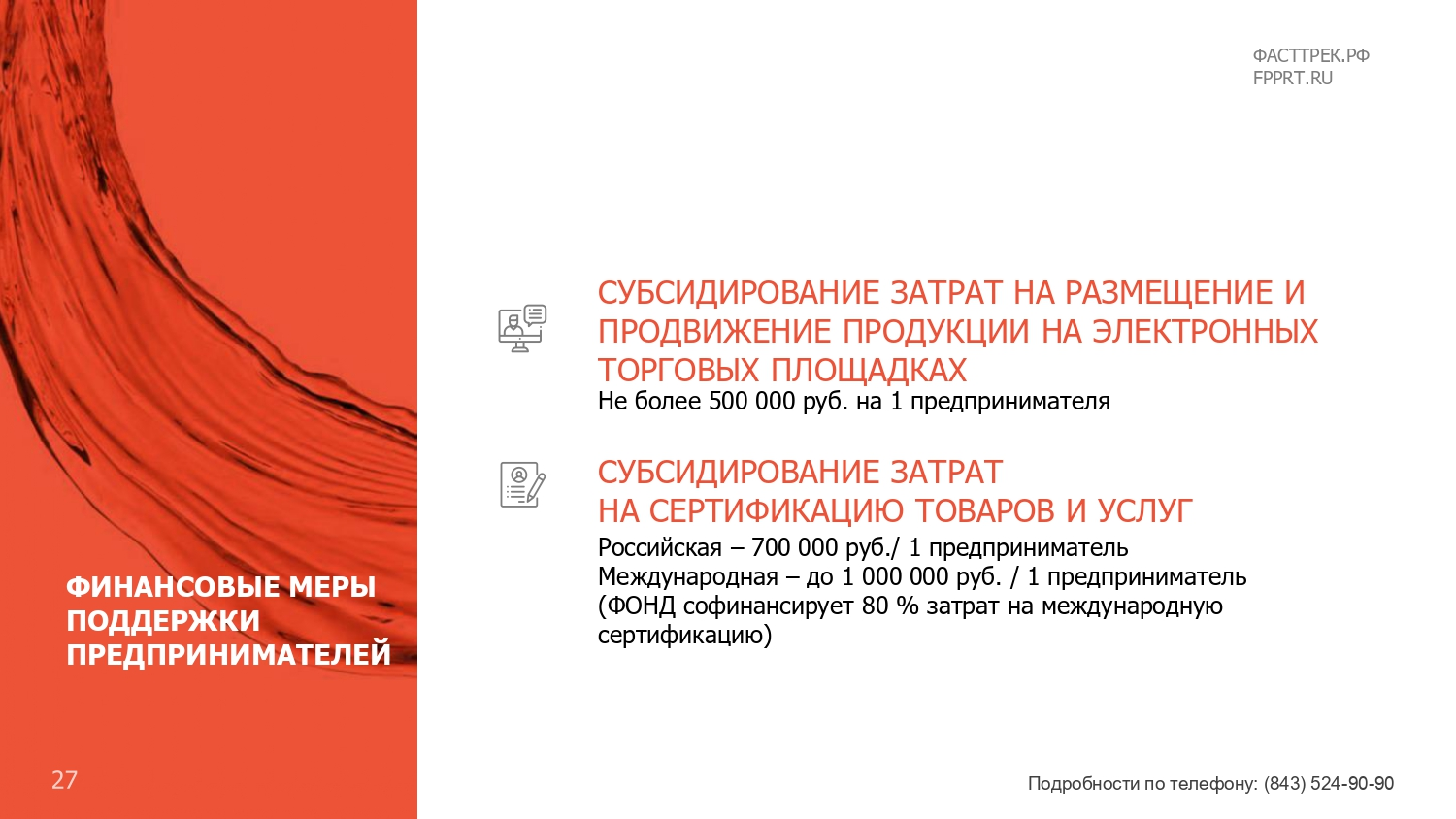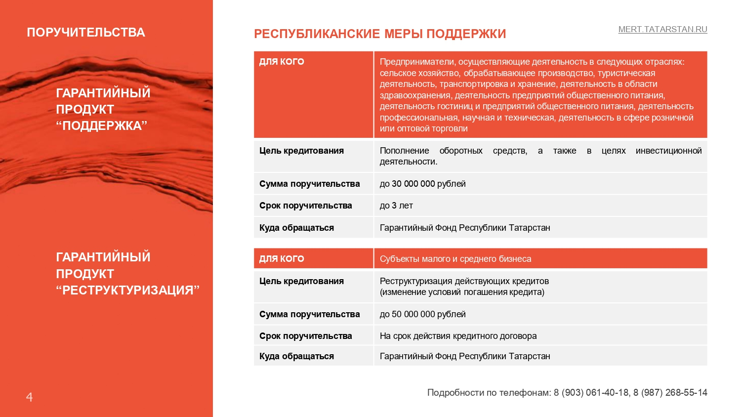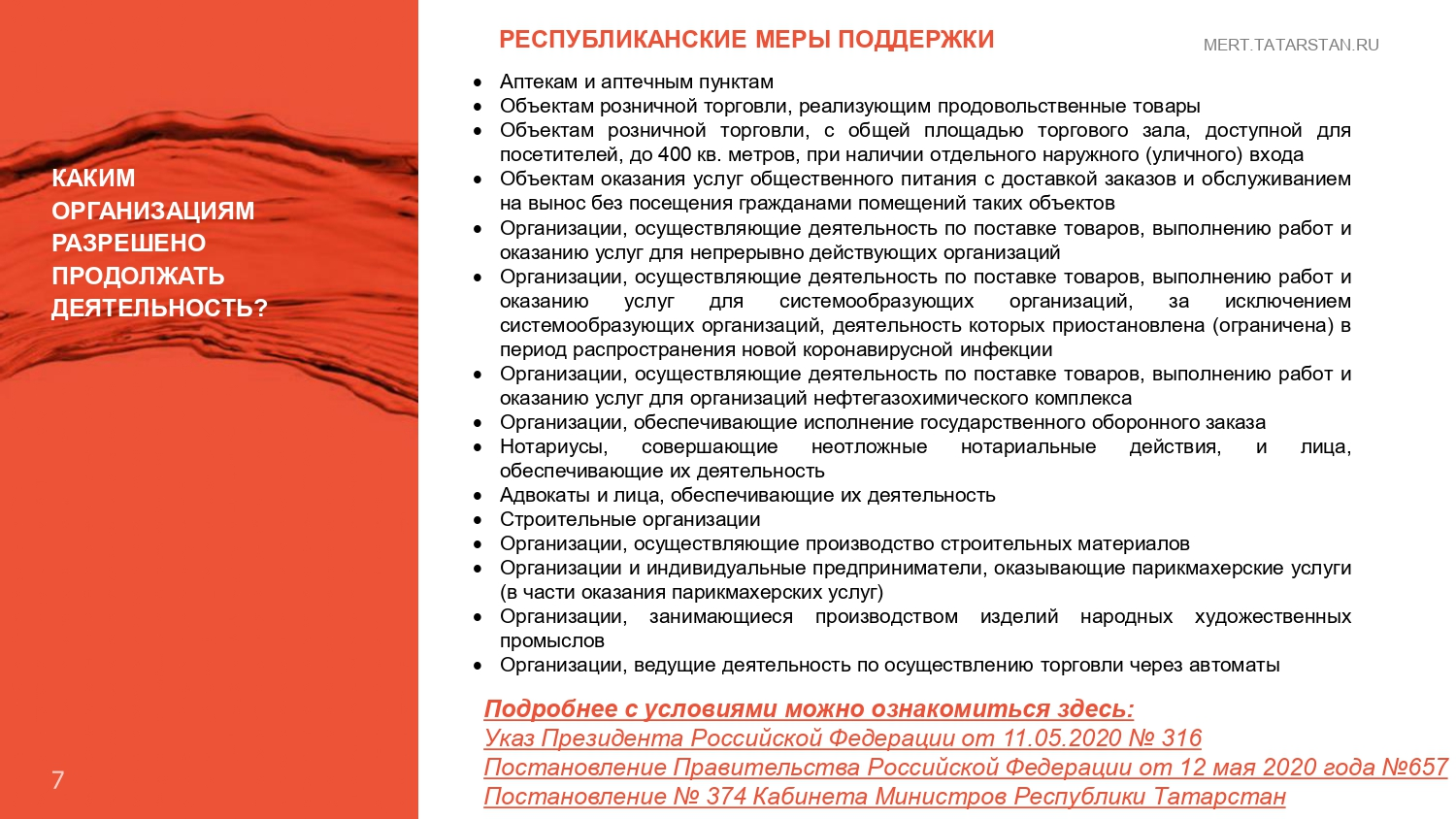 Хәзерге вакытта Татарстан Республикасында яңа коронавирус йогышы таралуны булдырмау буенча чаралар күрү шартларында, Татарстан Республикасы Икътисад министрлыгы тарафыннан икътисадның аеруча зыян күргән тармаклары исемлегенә кертелмәгән кече һәм урта эшкуарлык субъектларына ярдәм чаралары әзерләнде, аерым алганда, «Татарстан Республикасы эшкуарлыкка ярдәм итү фонды» коммерциячел булмаган микрокредит компаниясе тарафыннан ташламалы шартларда микрозаймнар бирү тәкъдим ителә, «Татарстан Республикасы кече һәм урта эшкуарлыгына ярдәм һәм аны үстерү программаларын гамәлгә ашыру үзәге» дәүләт казна учреждениесенә азык-төлек һәм азык-төлек продуктлары китерү хезмәтләре өчен түләүгә бәйле кредитлар һәм чыгымнар буенча процент ставкасын субсидияләү, шулай ук «Татарстан Республикасы Гарантия фонды» коммерциячел булмаган оешмасы тарафыннан «Ярдәм» заем акчаларын җәлеп итү һәм гамәлдәге кредит килешүләре буенча бурычларны реструктуризацияләү өчен «Реструктуризацияләү» гарантия продукты өчен җитәрлек залог белән тәэмин ителмәгән эшкуарлар өчен поручительлек.