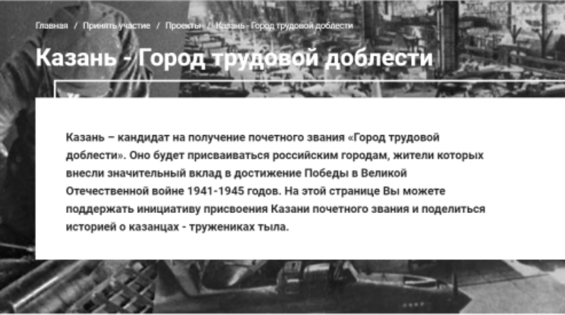Казан шәһәре Башкарма комитеты Татарстанлыларны Татарстан башкаласына «Хезмәт батырлыгы шәһәре» исемен бирү өчен тавыш бирергә чакыра. «Хезмәт батырлыгы шәһәре» мактаулы исеме Россия шәһәрләренә биреләчәк, аларда яшәүчеләр 1941-1945 еллардагы Бөек Ватан сугышында җиңүгә зур өлеш керткән. Казан-мактаулы исем алуга дәгъва кылучыларның берсе.