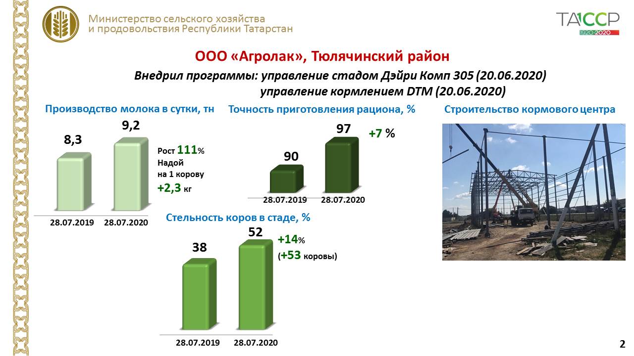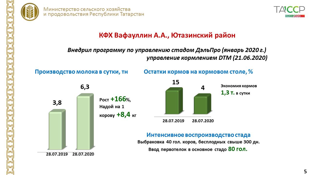 Тагын бер мисал - Ютазы районында Вафауллинның кечкенә генә фермер хуҗалыгы - ел башында терлекләр белән идарә итү программасын урнаштырды, аның ярдәмендә җитештерү процессларын җайга салды. 40 сыер, 300 көннән артык кысыр торган 40 сыер бракка чыгарылган. Шул ук вакытта хайваннар саны 80 танага арткан. Сыерларның тәүлеклек продуктивлылыгы 8,5 кг, тулаем савым 66 %ка арткан, ягъни - тәүлеккә 2,5 тоннага, ә акчалата алганда, бу айга 1,8 млн сумнан артык. Шул ук вакытта 1 ай эчендә ашатуга идарә итү көн саен 1,5 тоннага кадәр азыкны янга калдыру мөмкинлеген бирде. Технологияләрнең нәтиҗәлелеге күз алдында!