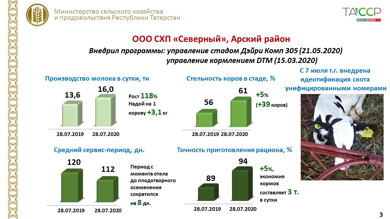 Арча муниципаль районының «Северный» АХП ҖЧҖендә алдынгы технологияләр куллану сөт җитештерү күләмен тәүлеккә 2,5 тоннага, ягъни 18 %ка, сыерларның продуктивлылыгын 3 кг-га, сыерларның сервис чорын 8 көнгә киметергә, сыерларның санын 5 %ка арттырырга мөмкинлек бирде. Бу сөт сатудан акчалата керемне аена 1,7 млн. сумга арттырырга ярдәм итте.