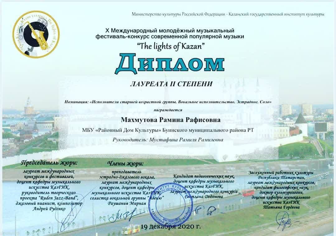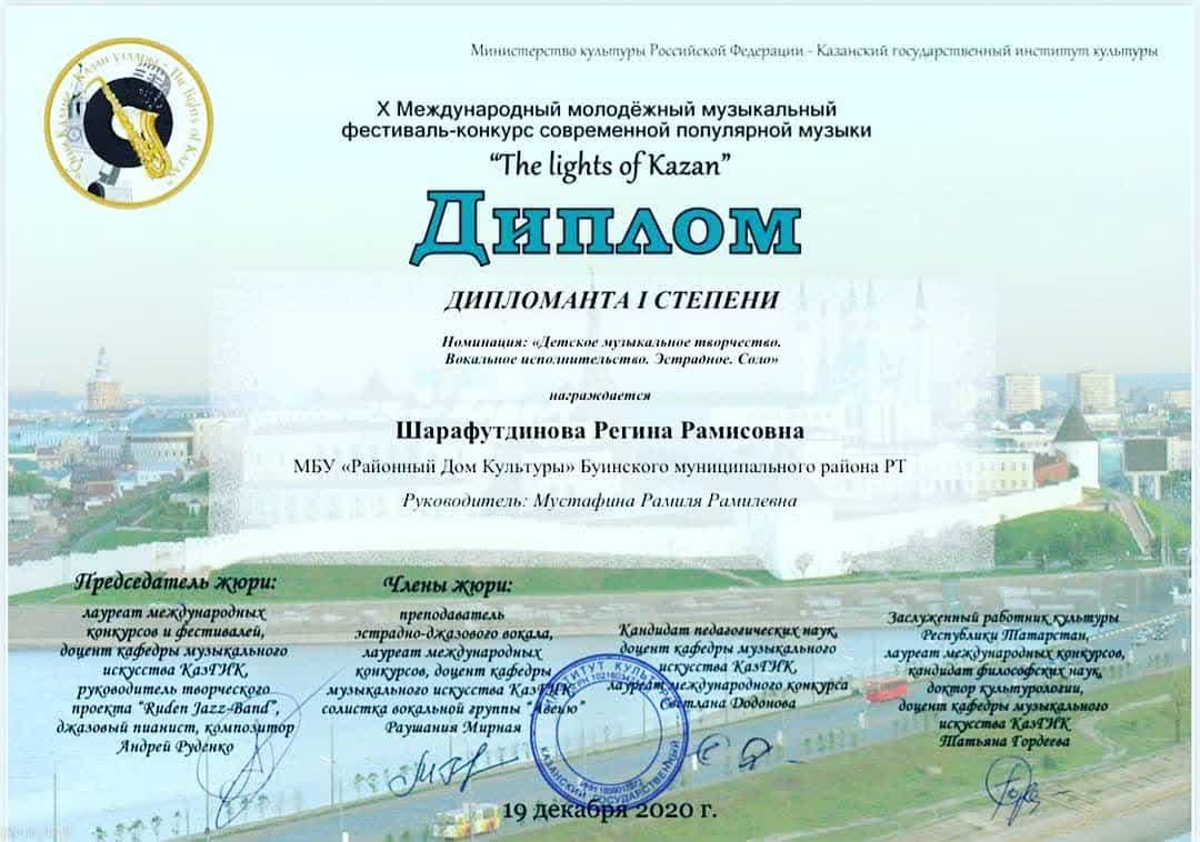 2020 елның 19 декабрендә Казан дәүләт мәдәният институтында «The lights of Kazan» («Казан утлары») хәзерге заман популяр музыкасын башкаручыларның X Халыкара яшьләр музыка фестивале - конкурсы узды. Конкурс конкурста катнашучылар тарафыннан Оештыру комитетына җибәрелгән видеоязмалар буенча бер турда үтте. Буа данын район мәдәният йортының Мостафина Рамилә Рамил кызы җитәкчелегендә «Kids time» эстрада вокалы студиясендә тәрбияләнүчеләр яклады . Яшь вокалчылар Рамина Мәхмүтова, Дарья Федотова, Рания Шәрәфетдинова, Дарья Иванова һәм Регина Шәрәфетдинова күп тапкырлар төрле дәрәҗәдәге конкурсларда катнашып, җиңү яулаганнар инде. Бу юлы да безнең кызларны уңыш көтте. Яшь талантларыбыз фестиваль-конкурс лауреатлары һәм дипломантлары булдылар. Мондый уңышлы чыгыш, әлбәттә инде, кызларның озак һәм тырыш хезмәте, педагогның һөнәри осталыгы һәм ата-аналар ярдәме нәтиҗәсе булды.