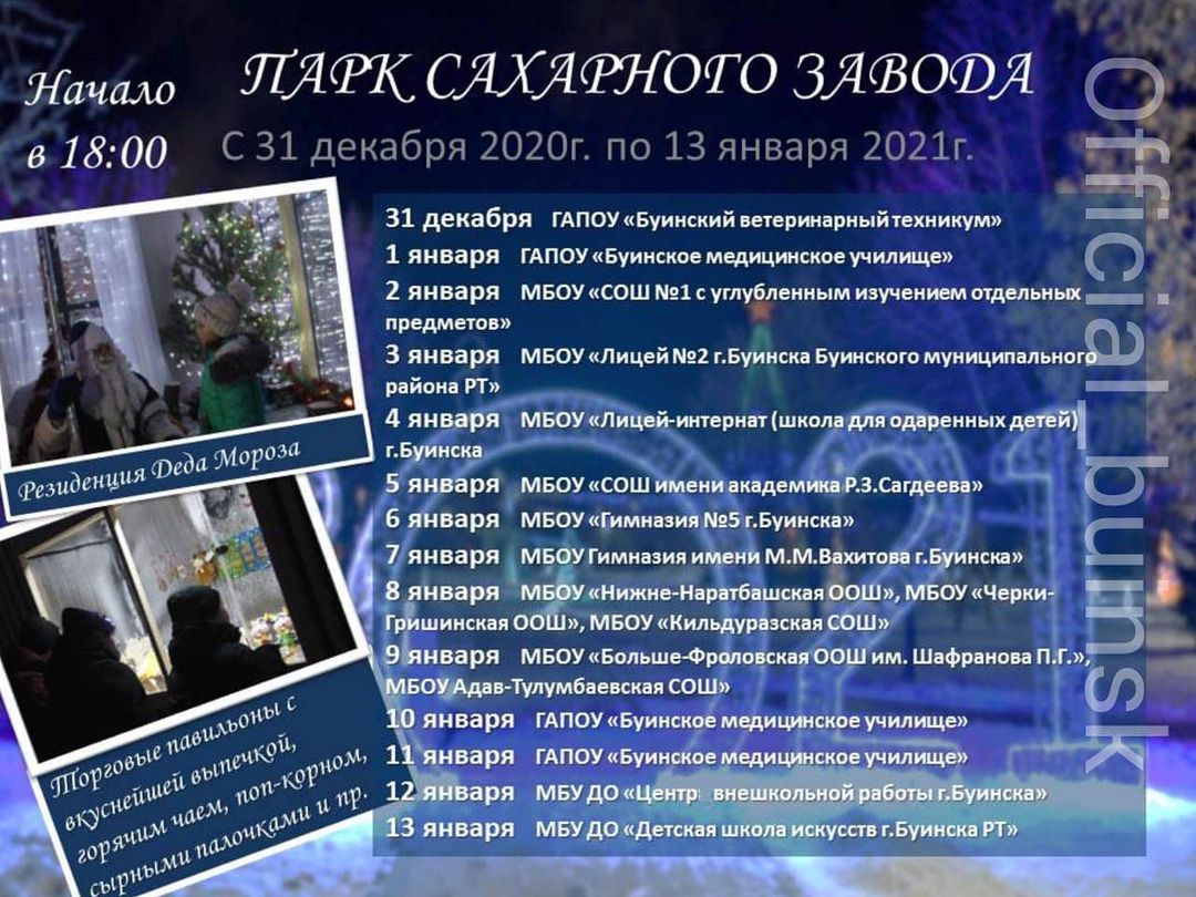 Шикәр заводы паркы территориясендә беренче тапкыр Кыш Бабай резиденциясе урнаштырылды. Барлык бәйрәмнәрдә безнең бабай балалар һәм өлкәннәрне шатландырачак, балалар хыялланган бүләкләр тапшырачак.
