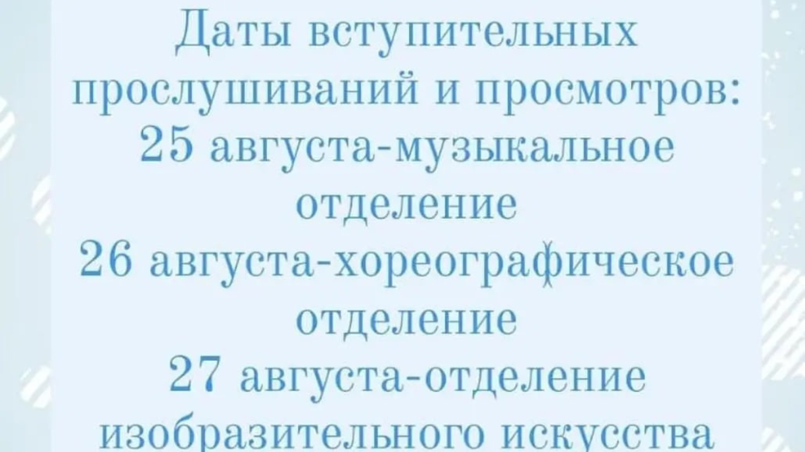 Сәнгать мәктәбе булачак беренче сыйныф укучыларын кереш сынауларга көтә, алар түбәндәге расписание буенча узачак: