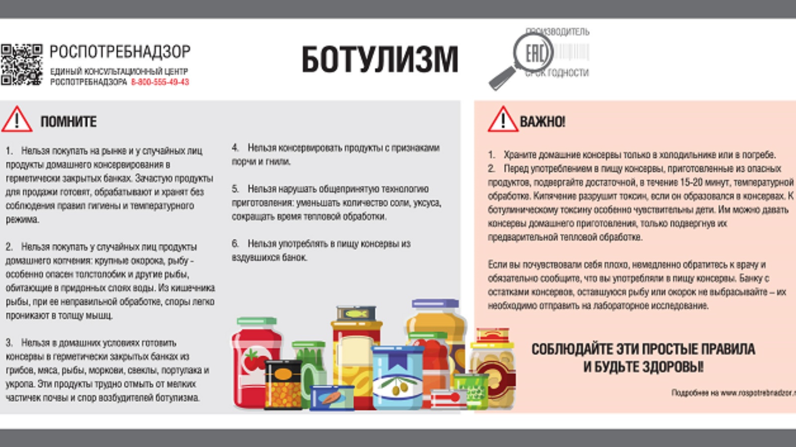 Йорт консервларын һәм азык — төлекне кышка актив әзерләү вакытында Роспотребнадзор ботулизм инфекциясе турында искәртә. Clostridium botulinum таякчыгы белән продукцияләнгән азык-төлек продуктларын куллану нәтиҗәсендә үзәк нерв сиситемасы зарарлану белән организмның интоксикациясе белән характерлана. Ботулотоксин иң көчле табигый агуларның берсе булып тора (кеше өчен 5-50 нг/кг тән массасы өчен үлем дозасы), һәм ярдәм сорап вакытында мөрәҗәгать итмәгәндә, үлем белән тәмамлана.