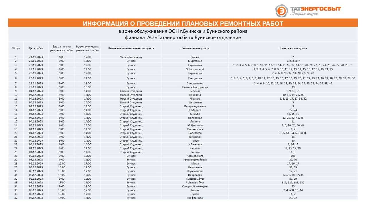 "Татэнергосбыт" АҖ филиалының Буа шәһәре һәм Буа районы хезмәт күрсәтү зонасында планлы ремонт эшләре үткәрү турында мәгълүмат