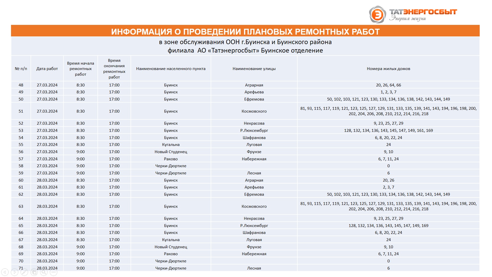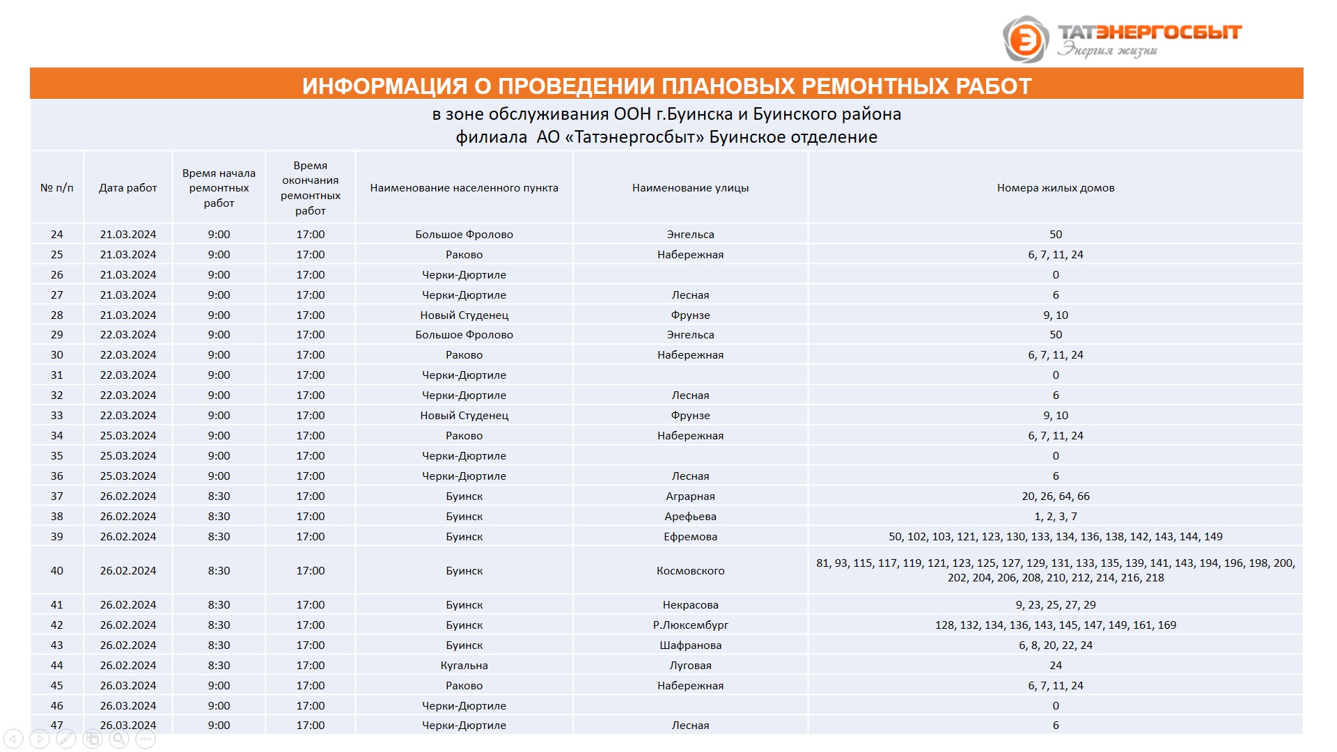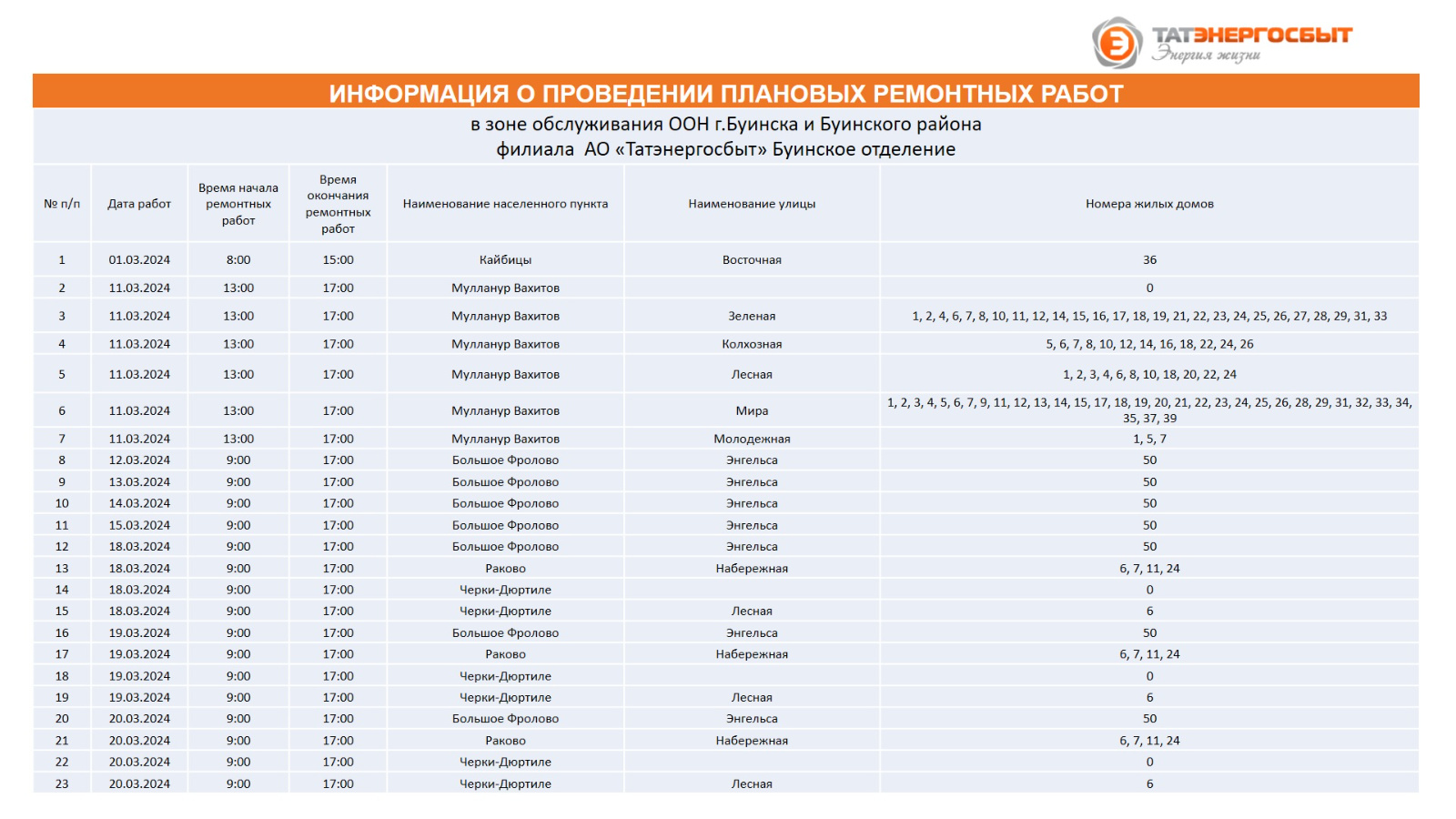 "Татэнергосбыт" АҖ филиалының Буа шәһәре һәм Буа районы хезмәт күрсәтү зонасында планлы ремонт эшләре үткәрү турында мәгълүмат