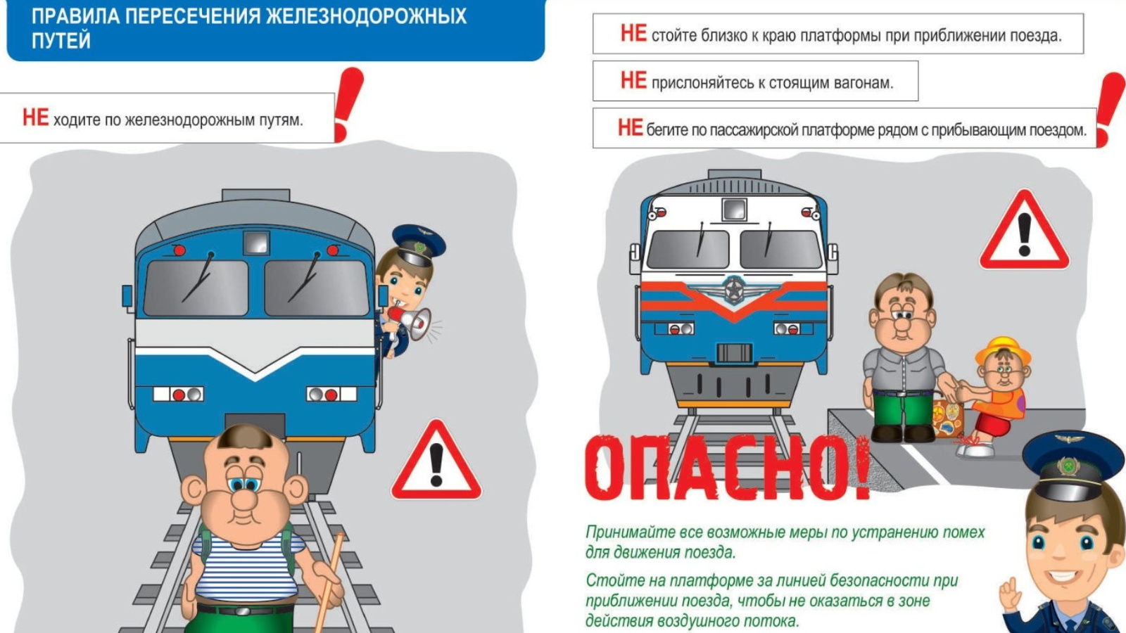 Бел! Поездны шунда ук туктатып булмый. Ашыгыч тормозлау вакытында локомотивның тормоз юлы 700дән 1200 метрга кадәр тәшкил итә. Тимер юл аша билгеләнгән урыннарда гына үтегез, хәрәкәт итүче поезд алдында аларны узмагыз. Бел! Контакт чыбыгындагы көчәнеш 27000 вольт. Электр тогы белән зарарланмас өчен, басып торган вагоннарның түбәләренә, тимер юл күперләренең металл конструкцияләренә менмәгез.