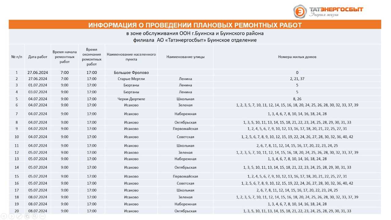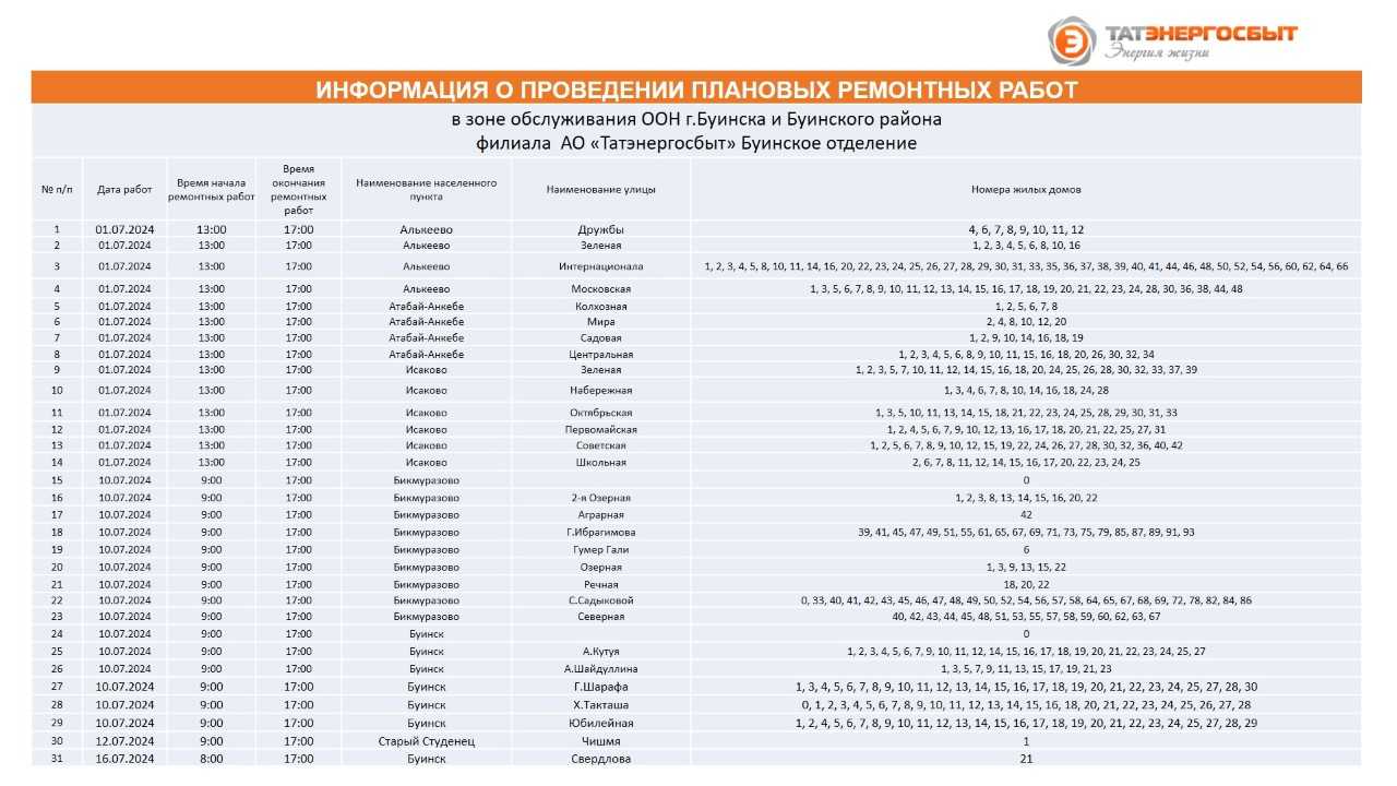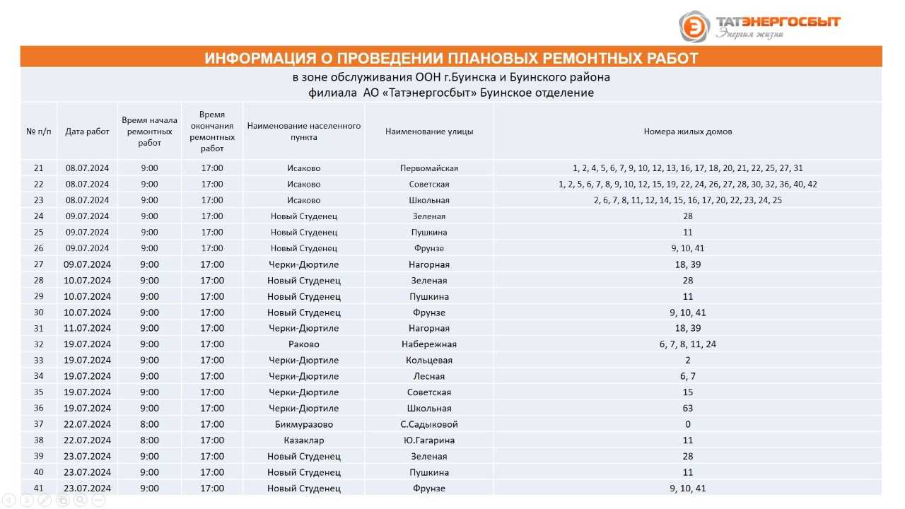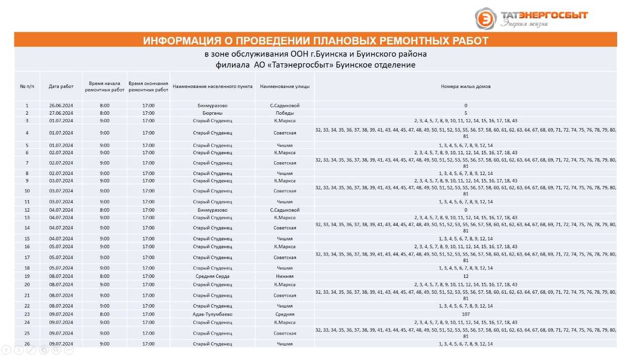 "Татэнергосбыт" АҖ филиалының Буа шәһәре һәм Буа районы хезмәт күрсәтү зонасында планлы ремонт эшләре үткәрү турында мәгълүмат