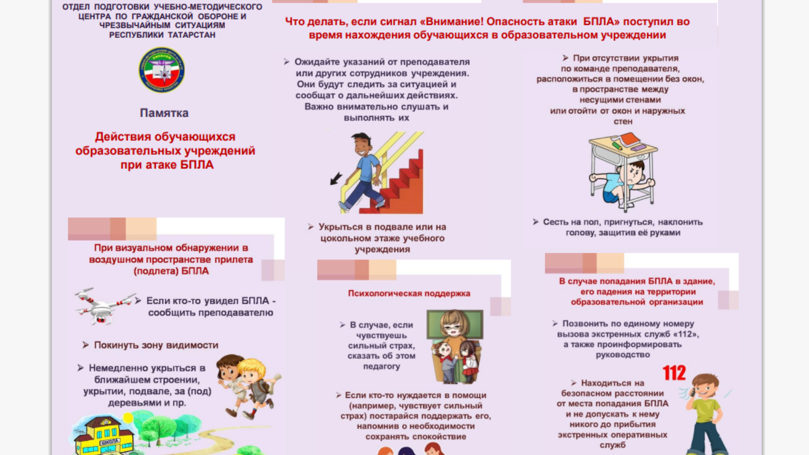 "Игътибар! Татарстан Республикасы! БПЛА һөҗүме тәмам " җитәкче состав күрсәтмәләре нигезендә эш итәргә, яшеренү урынын калдырырга һәм ата-аналарга (законлы вәкилләргә) белем бирү процессының вакытлыча туктатылуы турында хәбәр итәргә.