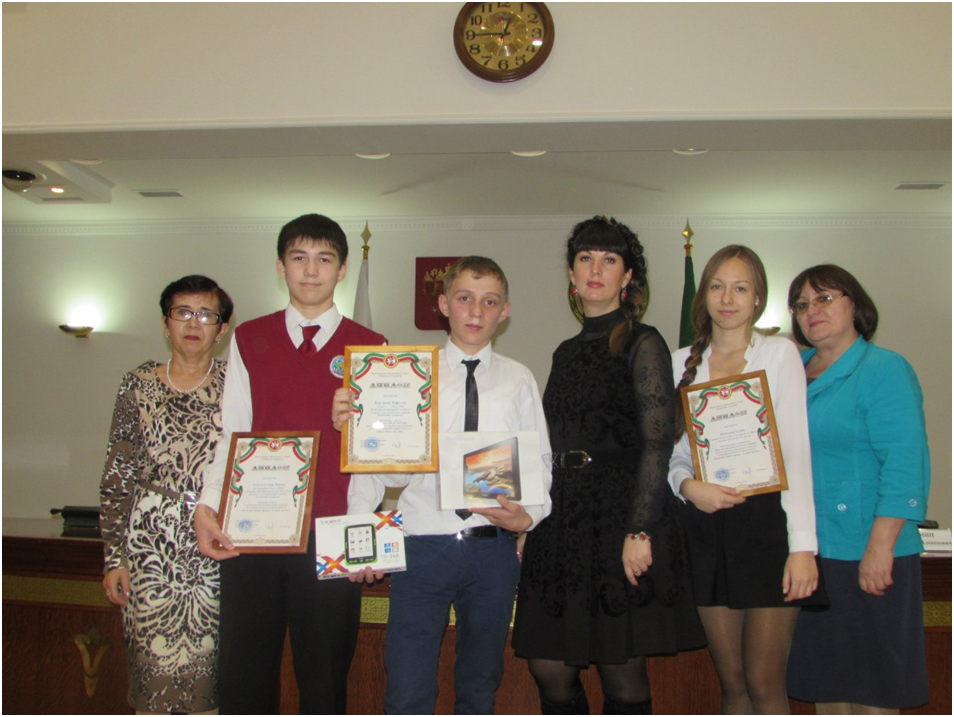Рафаэль бу җиңүе өчен укытучысы Алла Низамовага һәм I, II курс студентларыннан торган иҗади коллективка рәхмәтле. Соңгылары 12 минутлык видеофильмда уйнадылар, костюмнар тектеләр. Ә Рафаэль күп тапкырлар кабатланган дубльләрнең иң яхшыларын җыеп монтажлады, көен, тавышын сайлап яздырды. Хәзер аның буш вакытын иҗади эшкә багышларга җитди сәбәбе дә бар – бу конкурста җиңүе өчен аңа “Яңа гасыр” телерадиокомпаниясенең генераль директоры Илшат Әминов планшет бүләк итте. - Аны һәрчак үзем белән йөртәм. Башымда кызыклы идеяләр туса, шунда ук теркәп куя алам, - ди җи-ңүче. Ике укучы иншалар конкурсында уңышка ирештеләр. 1 номерлы мәктәптә белем алучы Раил Сөнгатуллин рус теле һәм әдәбиятыннан белем бирүче Фәния Мөхәммәтҗанова җитәкчелегендә 5-9 сыйныфлар арасында “Коррупциягә “Юк” дип әйтик” номинациясендә икенче урын яулады. М. Вахитов исемендәге гимназия укучысы Гөлия Юнысованың татар теле һәм әдәбияты укытучысы Рузинә Низамиева кул астында әзерләгән иншасы белән “Илем киләчәге – минем кулда” номинациясендә номинант булды. Татарстан Республикасы Президентының коррупциягә каршы көрәш сәясәте мәсьәләләре буенча Идарәсе начальнигы Марс Бәдретдинов, Мәгариф һәм фән министры урынбасары Лариса Сулима, Иҗтимагый палата рәисе Анатолий Фомин һәм башка җитәкчеләр кулыннан бүләк алу һәм истәлеккә фотога төшү аларны яңа җиңүләргә рухландырды. “Перспектива”да җиңделәр Шәһәрнең сәләтле балалар өчен лицей-интернатының 8 “А” сыйныфы укучылары Эмиль Садуровтан, Камил Хәсәновтан, Рафаэль Мөхәммиевтан торган командасының “Татарстан Республикасы өчен инновацияле 50 иң яхшы идея” республика конкурсында катнашуын хәбәр иткән идек инде. Алар анда да җиңүгә ирештеләр.