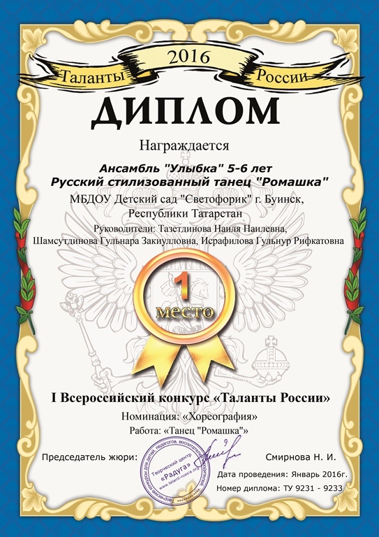 “Ромашка” рус биюе белән шәһәрнең “Светофорик” балалар бакчасында тәрбияләнүчеләр “Россия талантлары” беренче Бөтенроссия конкурсының “Хореография” номинациясендә беренче урын алдылар.