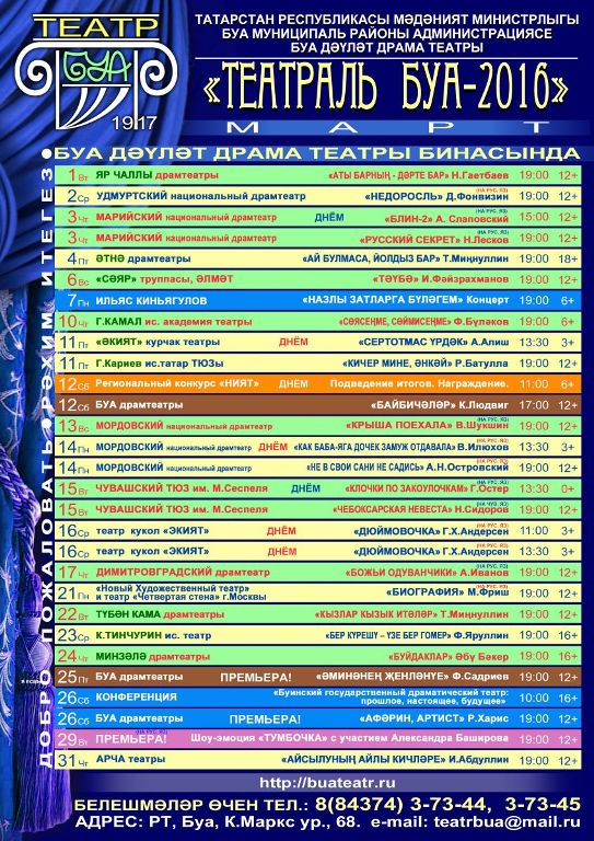 Кадерле буалы тамашачы, сөен! 1 марттан башлап 31енә кадәр Буа дәүләт драма театры бинасында һәр көнне спектакльләр куелачак. Рус телендә дә, татар телендә дә, чуаш телендә дә, олылар өчен дә, балаларга да. Десертка Буа театры артистлары башкаруында ике премьера!